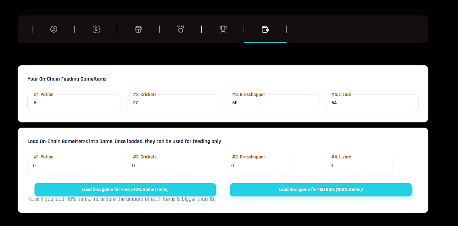 The bulletin board: โYour On-Chain Feeding Game Itemsโ shows the total number of game items on your on-chains.