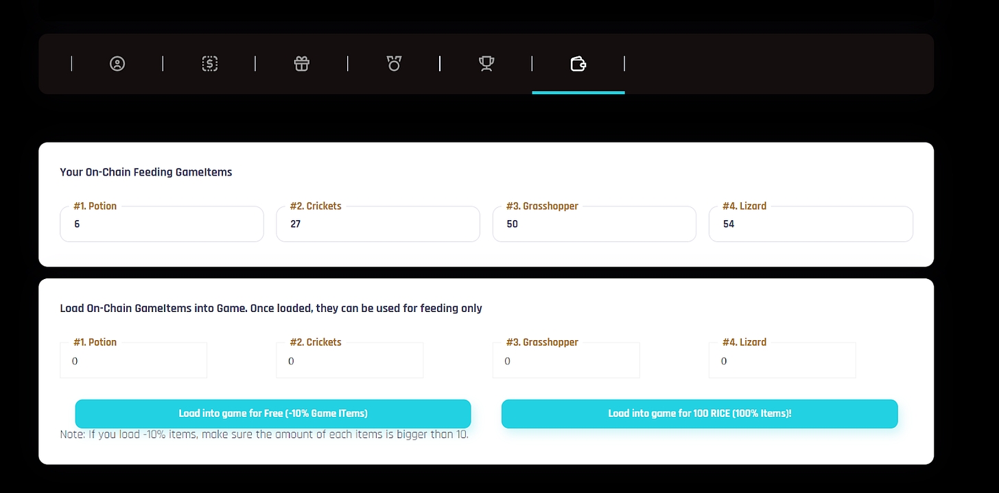 The bulletin board: “Your On-Chain Feeding Game Items” shows the total number of game items on your on-chains.