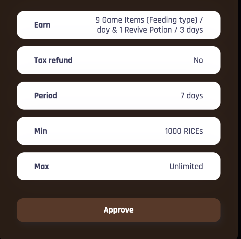 Beside purchasing Food Item on our Shop, you can also earn Food Item by staking RICE in our Pool!