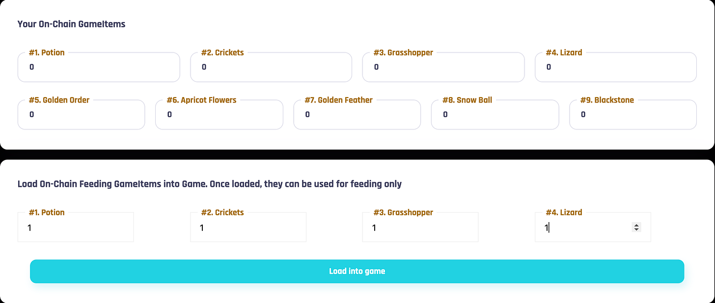 For on-chain items: You can trade on Marketplace. To feed your rooster, you need to load into game. Once it is loaded into game, you cannot sell them on Marketplace.