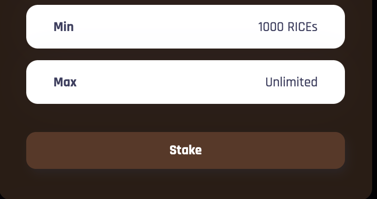 Example: If you Stake 10000 RICE, you will get 9x10= 90 Food items per day.